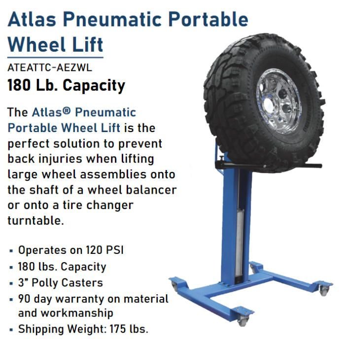 The Atlas AEZWL Pneumatic Portable Wheel Lift is the perfect solution to prevent back injuries when lifting large wheel assemblies onto the shaft of a wheel balancer, onto a tire changer turntable, or even removing or installing tires on a car raised on a scissor or two post lift.