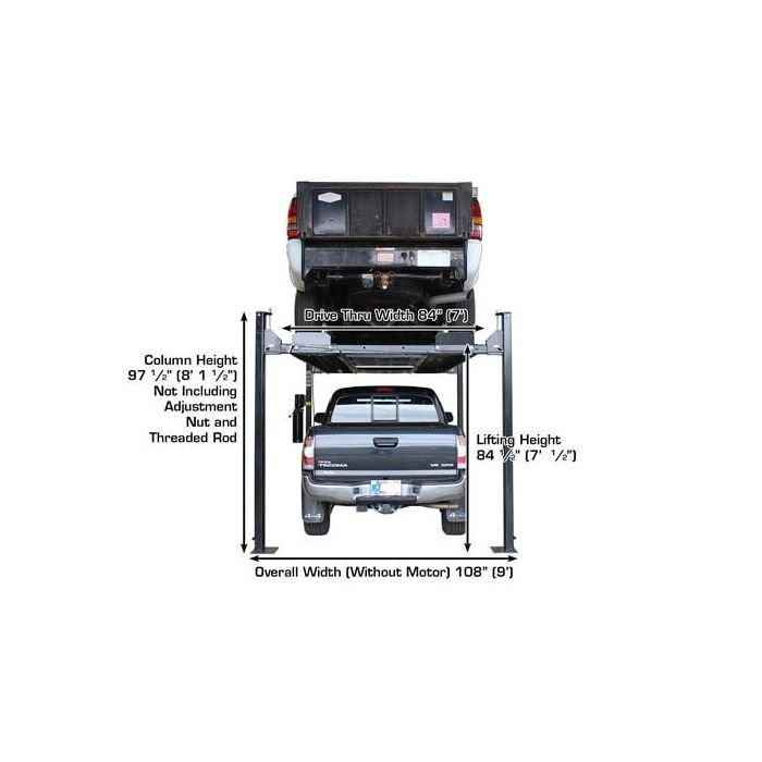 The Atlas Garage Pro 8000 EXT-L in an extra long and slightly wider Service / Storage Lift. This lift is 20 inches longer (wheelbase) and 3 inches wider than the Atlas Garage Pro 8000EXT. Or to compare to the original, this lift is 20 inches longer (wheelbase), 3 inches wider, and 14 inches taller than the Atlas Garage Pro 8000! The extra runway length will accommodate almost all of the longer wheelbase pickup trucks, except duallys. Check out the Atlas Garage Pro 9000 if you need a portable lift for your dually!
