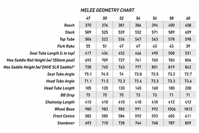 The Melee takes design cues from the ENVE Custom Road, but where the Custom Road prioritizes customization, the Melee prioritizes efficiency and speed. With geometry optimized around 27 to 32 mm tires, the Melee dials up the versatility with the ability to fit up to 35 mm tires, allowing you to tune your Melee to meet the needs of the day.