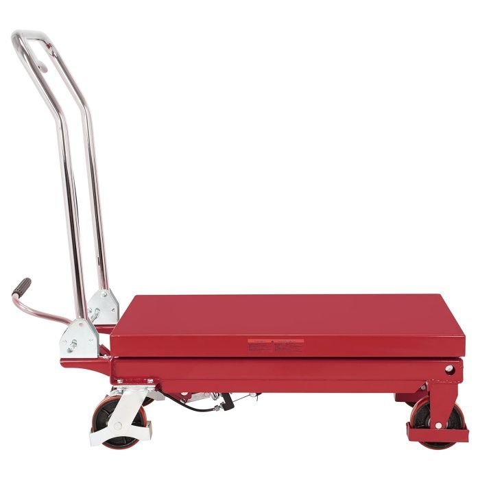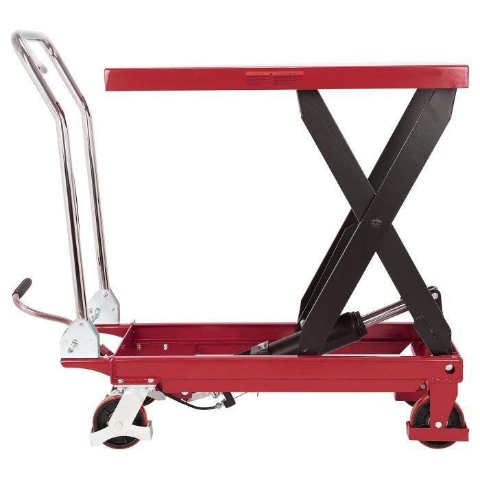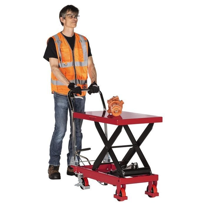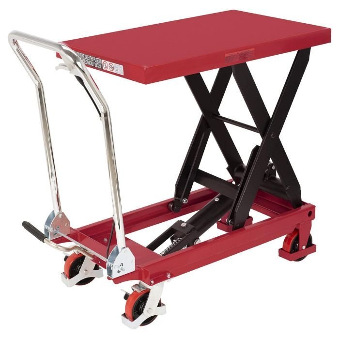 The American Forge & Foundry is heavy-duty all steel constructed table cart is used for material handling and features a foot operated pedal for fast and easy adjustment. A built-in scissor leg has the strength to lift up to 1,100 lbs.