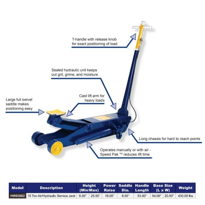 The Hein-Werner HW93662 10-Ton Air Assist Long Chassis Service Jack is quick, reliable, and convenient. Ideal for lifting trucks, trailers, and buses by the axle, differential, or frame. The handle adjusts to three pumping positions and the long chassis provides accessibility to hard to reach points. Dual piston action provides speed to contact and power to lift. A long chassis makes it easy to access the hard-to-reach points. The handle adjusts to three pumping positions and the T-handle with a release knob allows for the exact positioning of the load. The sealed hydraulic unit keeps out dirt, grime, grit, and moisture for longevity. Features cast lift arm for heavy loads. Operates manually or with air assist.