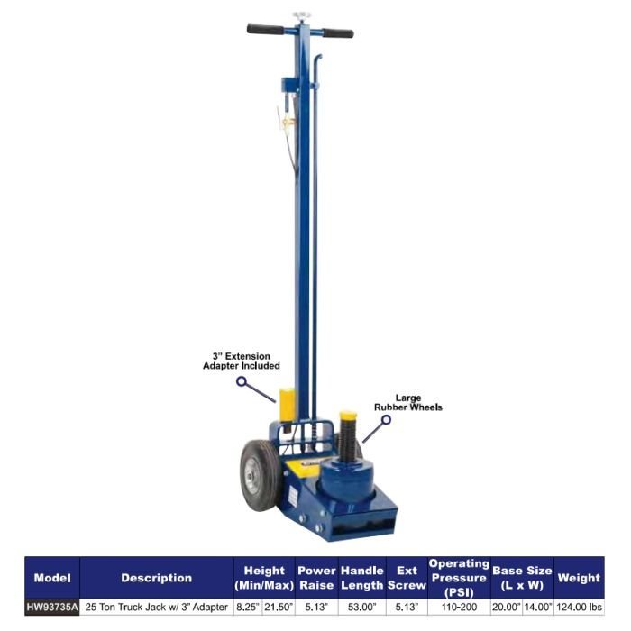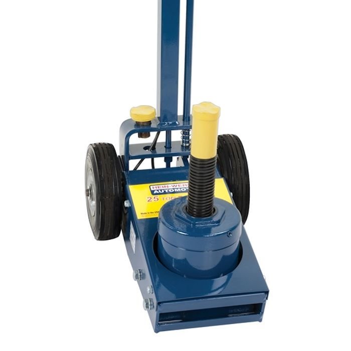 The Hein-Werner 25-Ton Air Truck Axle Jack with 3″ Extension is a compact and powerful professional air hydraulic truck jack with a specially coated ram to prevent rust and extend the life of the jack. Features include low minimum height, rapid two-speed air hydraulic lifting action, air-power ram retraction, large 8″ rubber wheels, pressure safety relief valve, and with 3″ extension. This premium quality air hydraulic truck jack is Made In the USA.