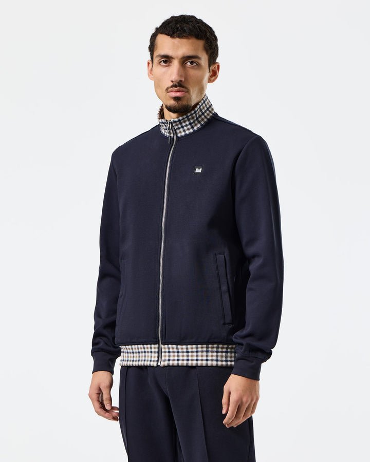 Expertly crafted with knitted 70% Cotton and 30% Polyester 285gsm interlock jersey, the Weekend Offender Alameda Track Top Navy offers a smooth, stylish look with its double knit construction. Its signature mid house check jacquard rib to the funnel neck and hem add a touch of sophistication, while the metal zip and concealed pockets provide convenience. Finished with a small WO badge on the chest.